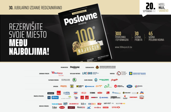 „Na gala svečanosti koju ćemo organizirati 20. septembra, povodom dva jubileja 30. izbora ‘100 najvećih u BiH’ i 45. rođendana Poslovnih novina, dodijelit ćemo tradicionalno i priznanja najboljim kompanijama u BiH. To će biti i prilika da prezentiramo i poklonimo svim prisutnim redizajnirano kolekcionarsko izdanje Poslovnih novina – 100 najvećih u BiH, u kojem je rangirano skoro 800 kompanija, a koje je ujedno i presjek bh. privrede. Ove godine, po prvi put, objavit ćemo i top 500 kompanija u regionu. U ovoj specijalnoj publikaciji bit će predstavljene i brojne vodeće bh. kompanije koje su se ove godine našle u društvu uspješnih. Poslovne novine ove godine obilježavaju svoj 45. rođendan, i s pravom možemo reći da je istorija modernog privrednog novinarstva u BiH započela izdavanjem Poslovnih novina, koje su 1972. godine bile nedjeljni stručni informativni list za privredna pitanja. Te godine objavile su i prvu monografiju privrede Bosne i Hercegovine. Nastavljajući dugogodišnju tradiciju poslovnog novinarstva, a u skladu s trendovima, u novembru ove godine, organizirat ćemo i konferenciju ‘Pouzdanost 2017’, na kojoj ćemo dodijeliti i priznanja kompanijama s natprosječnim pokazateljima poslovanja.“